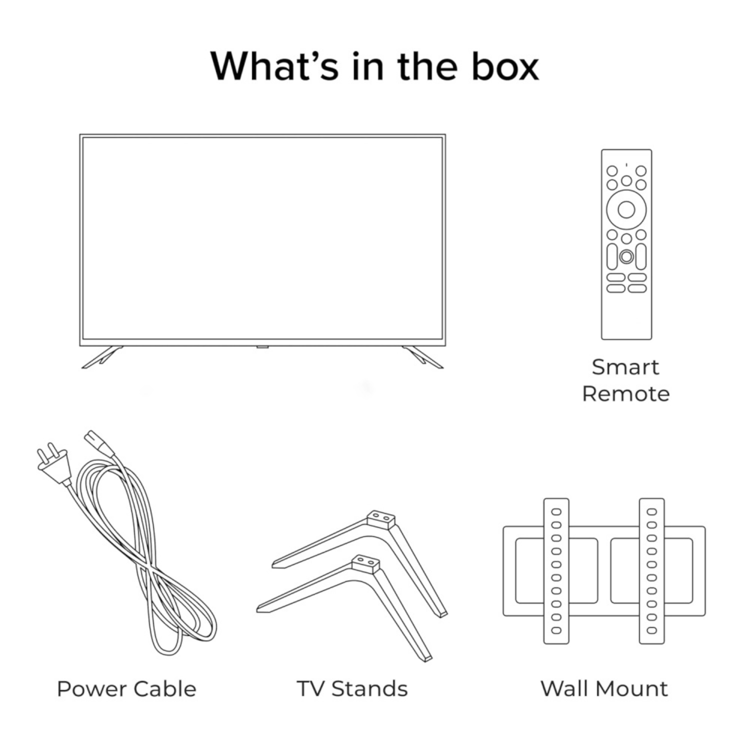 Inside the box, you get everything required for installation, including a smart remote, power cable, TV stands, and a wall mount.